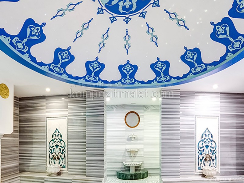 CTP hamam tavanları; kubbe, yarım kubbe, tonoz ve kavisli formlar başta olmak üzere farklı geometrilerde üretilebilmektedir. Bu özel formlar, buharın tavan yüzeyinde yoğunlaşarak damlama oluşturmasını engeller ve yoğuşmanın kontrollü şekilde yönlendirilmesini sağlar. Böylece kullanıcı konforu artırılırken, mekânın estetik algısı da güçlendirilir. Projeye özel ölçü ve tasarım seçenekleri sayesinde, geleneksel Türk hamamı mimarisinden modern spa ve wellness konseptlerine kadar geniş bir mimari uyum sağlanmaktadır.